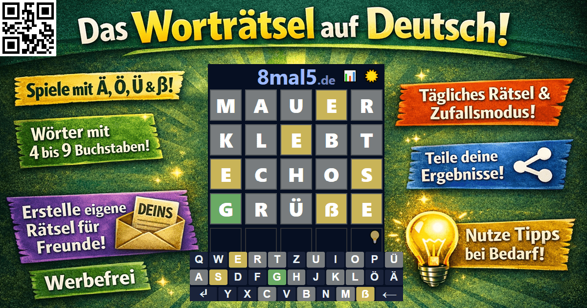 Hier geht’s direkt zum Spiel (Wordle-Alternative auf Deutsch), oder scanne den QR-Code im Bild mit einem Handy.